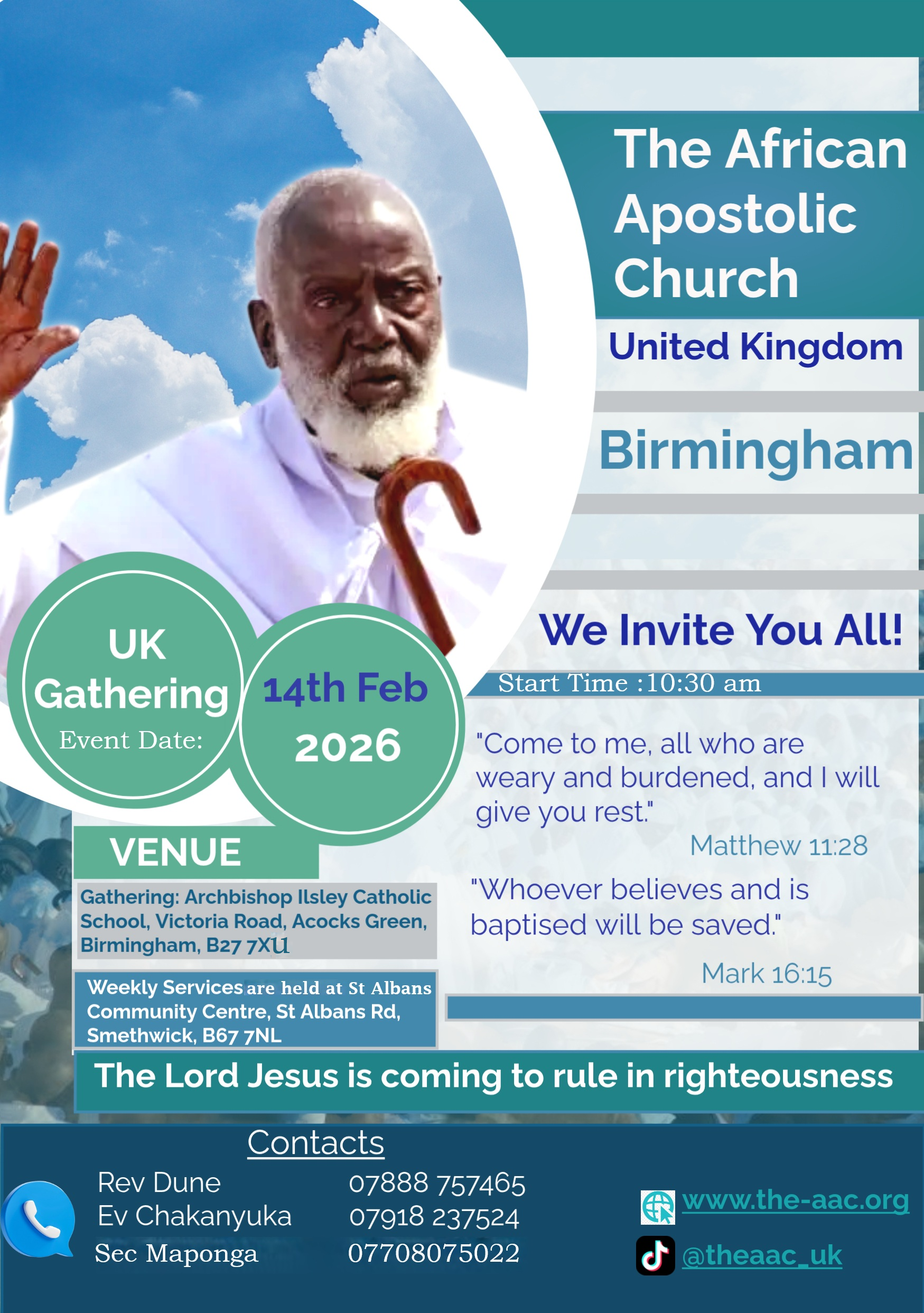 We welcome you in the name of our Lord Jesus Christ to the African Apostolic Church and we invite you to join us in worship, love and serving our blessed Saviour. The African Apostolic Church is awaiting the coming of Our Lord Jesus Christ to judge and rule the world in righteousness. Today is the time to prepare ourselves, as the ripened grain awaits its harvest time. A personal bonding relationship with God is the priority for all believers. The Church is there to support and foster your relationship with God through the word of God that transforms your life, to live a life of power, and overcome all your trials and tribulations. The African Apostolic Church maintains the principles of worshipping God; since God is the same yesterday, today, and forever (Rev 22:13). Our customs and conduct are those of the original Apostles as established in the Holy Bible. Following a series of revelations from God, the African Apostolic Church was established in 1959 in Zimbabwe (Guvambwa), under the leadership of Ernest Paul Mwazha.